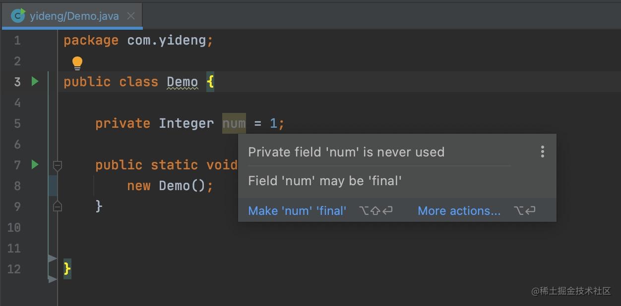 会按照阿里Java开发手册上规范帮我们检查代码,然后对代码做不同颜色展示,鼠标放上去,会看到提示内容,帮助我们写出更规范的代码。