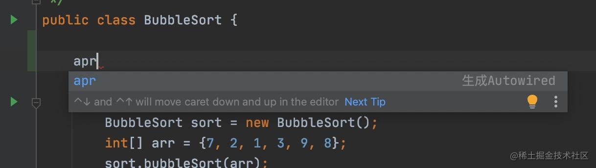 只要输入apr,就能自动提示,并且生成Autowired语句了。可以根据自己的代码习惯,自定义一些代码模板,帮助我们快速写代码。